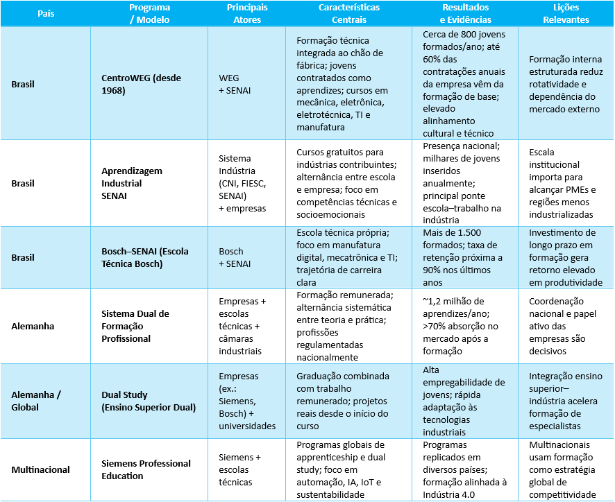 No plano internacional, o sistema dual alemão envolve cerca de 1,2 milhão de aprendizes por ano, com mais de 70% de absorção no mercado de trabalho. Multinacionais como Siemens e Bosch replicam modelos de apprenticeship e dual study globalmente.